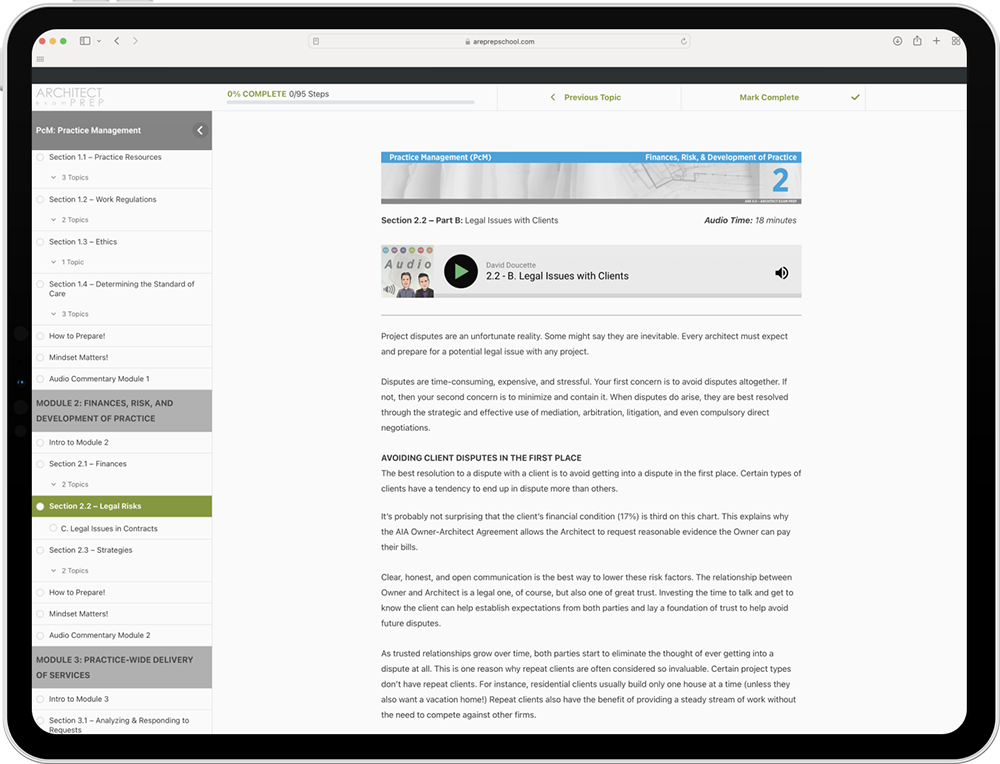 Thanks for making sure the information gets to us. Luckily, I used the PPP and passed the first time – thank you! I have since passed my remaining exams and am now a licensed Architect! Thanks for your exam guides and the podcasts to support me along the way!